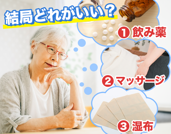 | 飲み薬 | 整体・マッサージ | 湿布・塗り薬 | |
